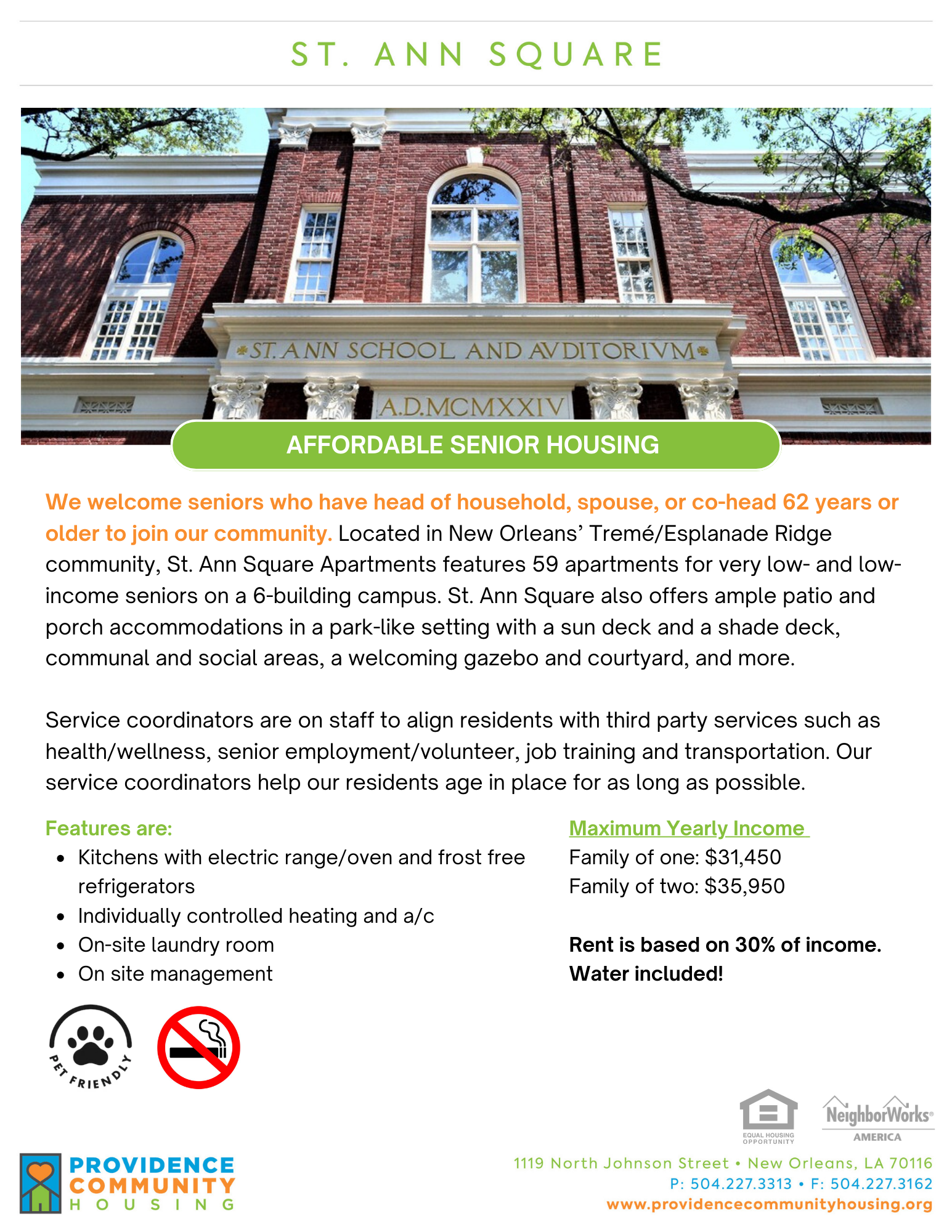 Located in New Orleans’ Tremé/Esplanade Ridge community, St. Ann Square Apartments features 59 apartments for very low- and low-income seniors on a 6-building campus. St. Ann Square also offers ample patio and porch accommodations in a park-like setting with a sun deck and a shade deck, communal and social areas, a welcoming gazebo and courtyard, access to on-site laundry, and more.
