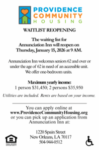 The waiting list for Annunciation Inn will reopen on Thursday, January 15, 2026 for one-bedroom units.