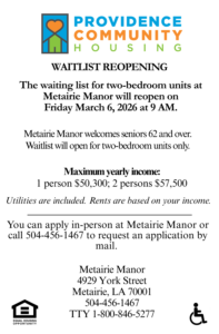 The waiting list for Metairie Manor will reopen on Friday, March 6 at 9 AM, 2026 for two-bedroom units only.